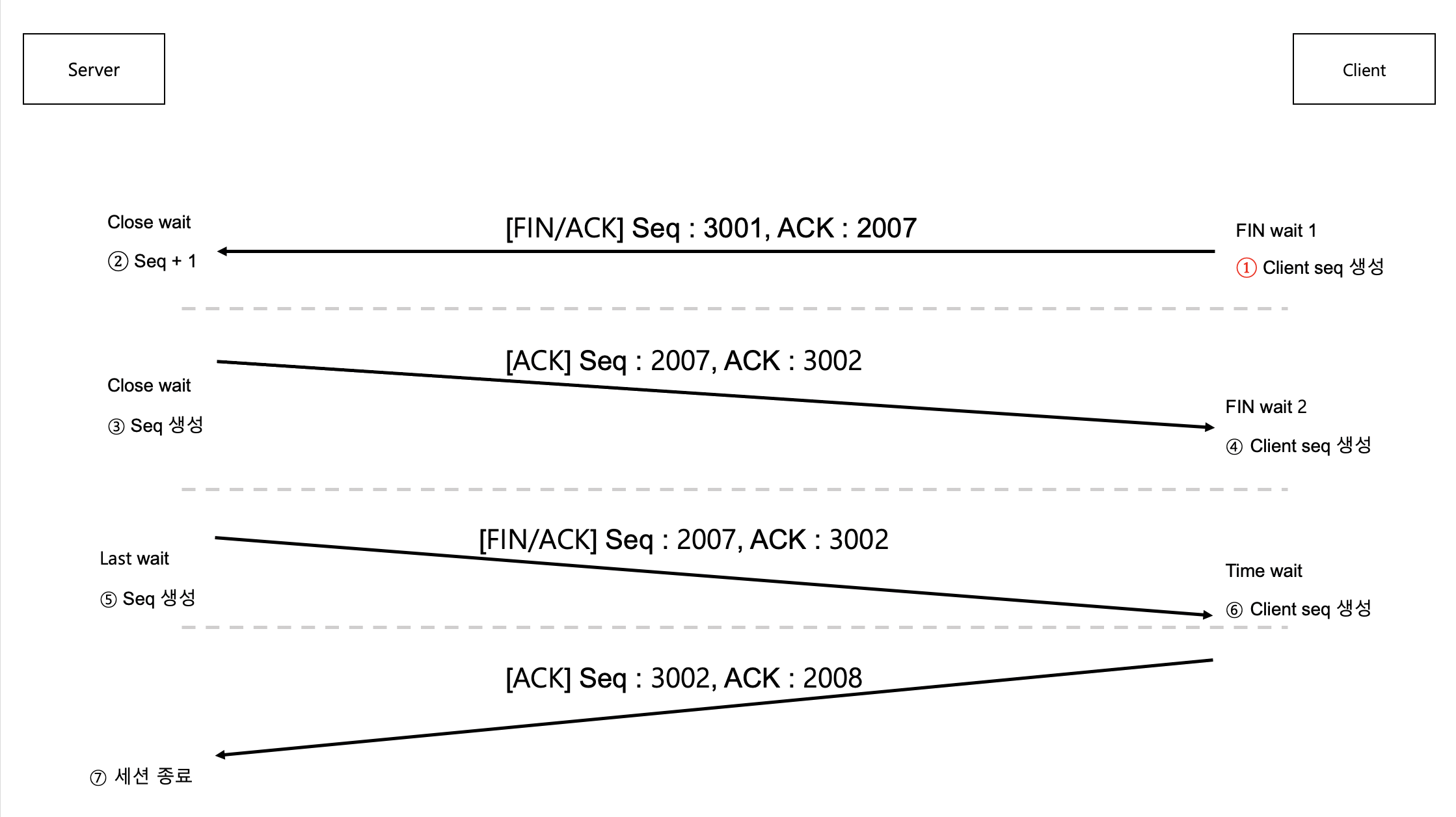 Client는 오른쪽에 있고, Server는 왼쪽이며 Client에서 연결을 알리며 시작을 한다.