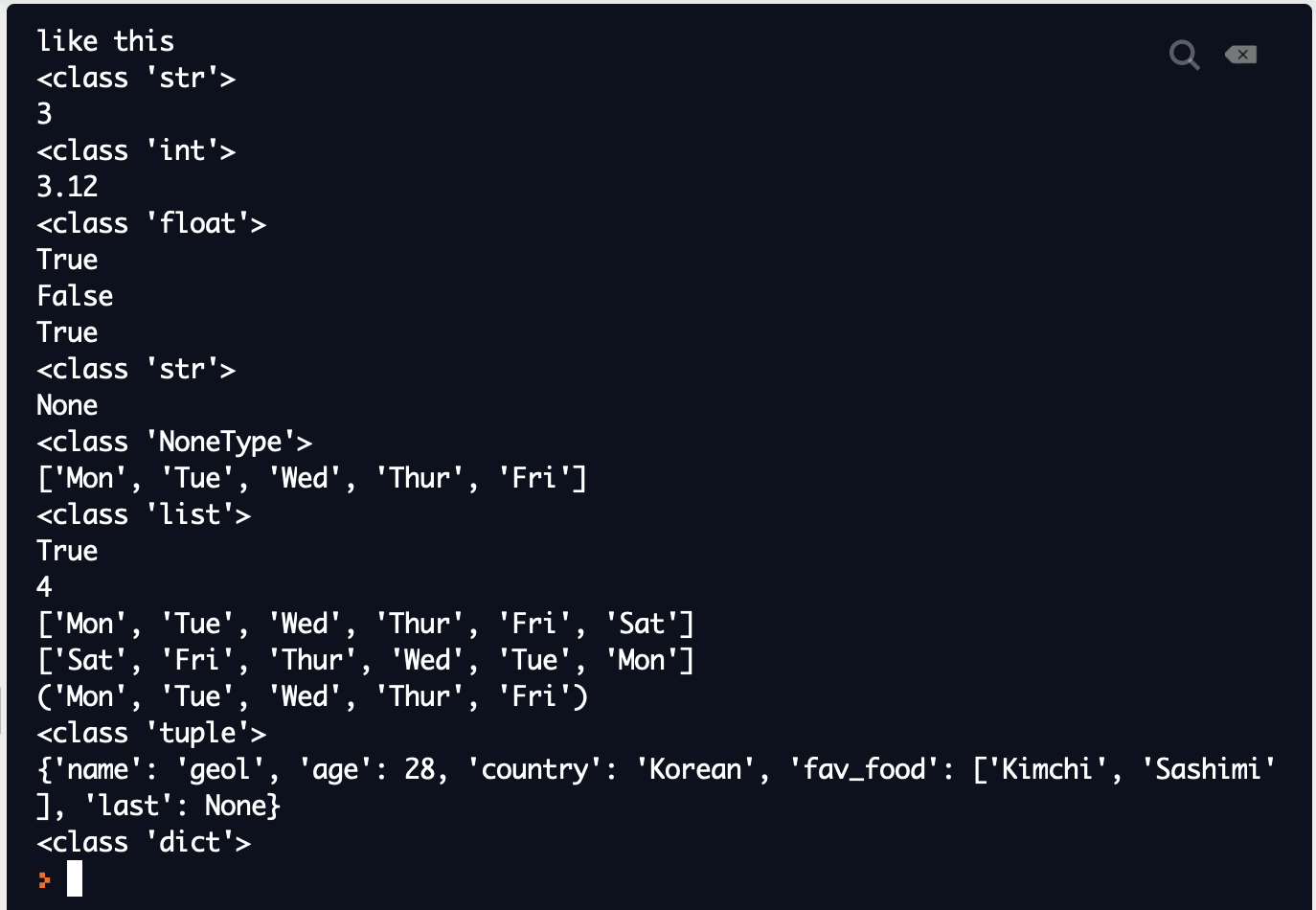 a_string = "like this" a_number = 3 a_float = 3.12 a_boolean = True b_boolean = False b_string = "True" a_none = None print(a_string) print(type(a_string)) print(a_number) print(type(a_number)) print(a_float) print(type(a_float)) print(a_boolean) print(b_boolean) print(b_string) print(type(b_string)) print(a_none) print(type(a_none)) days = ["Mon", "Tue", "Wed", "Thur", "Fri"] print(days) print(type(days)) print("Mon" in days) print(len(days[3])) days.append("Sat") print(days) days.reverse() print(days) # 변경 불가능한 튜플. days_tuple = ("Mon", "Tue", "Wed", "Thur", "Fri") print(days_tuple) print(type(days_tuple)) # days_tuple.append("Sat") is error. # 딕셔너리 days_dic = { "name" : "geol", "age" : 28, "country" : "Korean", "fav_food" : [ "Kimchi", "Sashimi" ], "last" : (None) } print(days_dic) print(type(days_dic))결과값